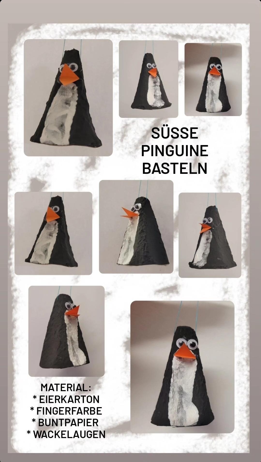 Die Kartonspitzen, die zur Stabilisierung der Eier dienen, abtrennen. Schwarz und weiß anmalen. Zum Schluss aus orangenem Papier einen Schnabel ausschneiden und Wackelauen auf den Pinguin kleben. Wer mag, kann ihn an Bindfäden aufhängen – aber die Pinguine stehen auch gut.