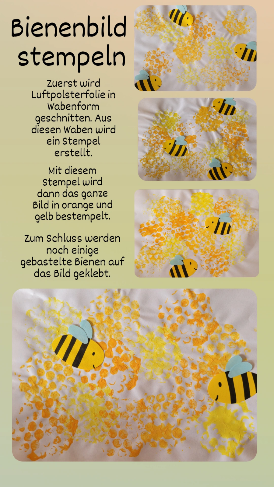Zuerst wird Luftpolsterfolie in Wabenform geschnitten, um mit orangener und gelber Folie Waben auf ein Papier zu stempeln. Aus Karton kann man Bienen basteln und als zusätzliche Deko aufkleben