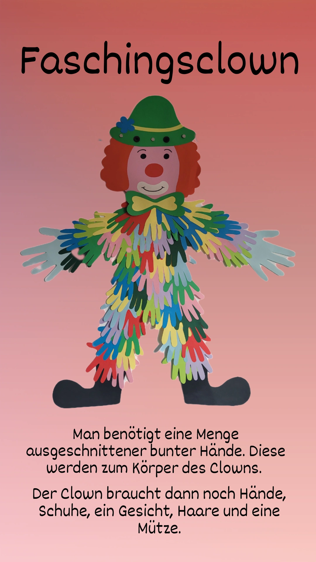Für jedes Kind den Umriss seiner Hand auf buntes Papier nachzeichnen und ausschneiden – je mehr Hände man ausschneidet und je mehr Farben verwendet werden, desto besser, weil der Clown viel farbenfroher und größer wird. Aus den ganzen ausgeschnittenen Papierhänden werden Arme und Beine eines Clowns geformt. Mit einem Paar Schuhe und einem Gesicht samt Hut wird aus den bunten Flecken ein schöner Clown!