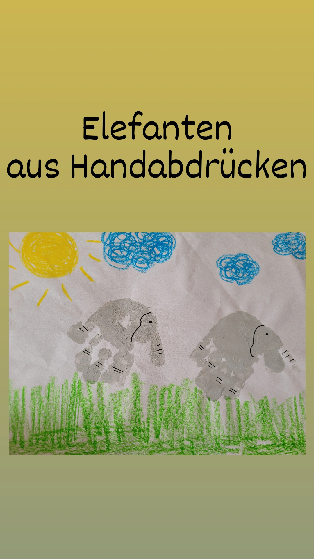 First, a landscape in which the gray elephants will soon be cavorting is drawn with wax crayon: sun, clouds and grass. Then a handprint is made on the paper with gray paint so that four fingers form the legs and the thumb the trunk. Add eyes, ears and a few folds – and the elephant parade can begin!