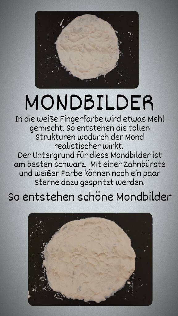 Mischt man Mehl in weiße Fingerabdrücke, ergibt sich eine Paste, mit der man strukturierte Bilder malen kann. Auf schwarzem Kartonpapier lassen sich so Monde malen, die eine wunderschön marmorierte Struktur aufweisen – ganz wie der echte Mond. Wer mag, kann mit einer Zahnbürste und weißer Farbe noch ein paar Sterne ins Weltall spritzen.