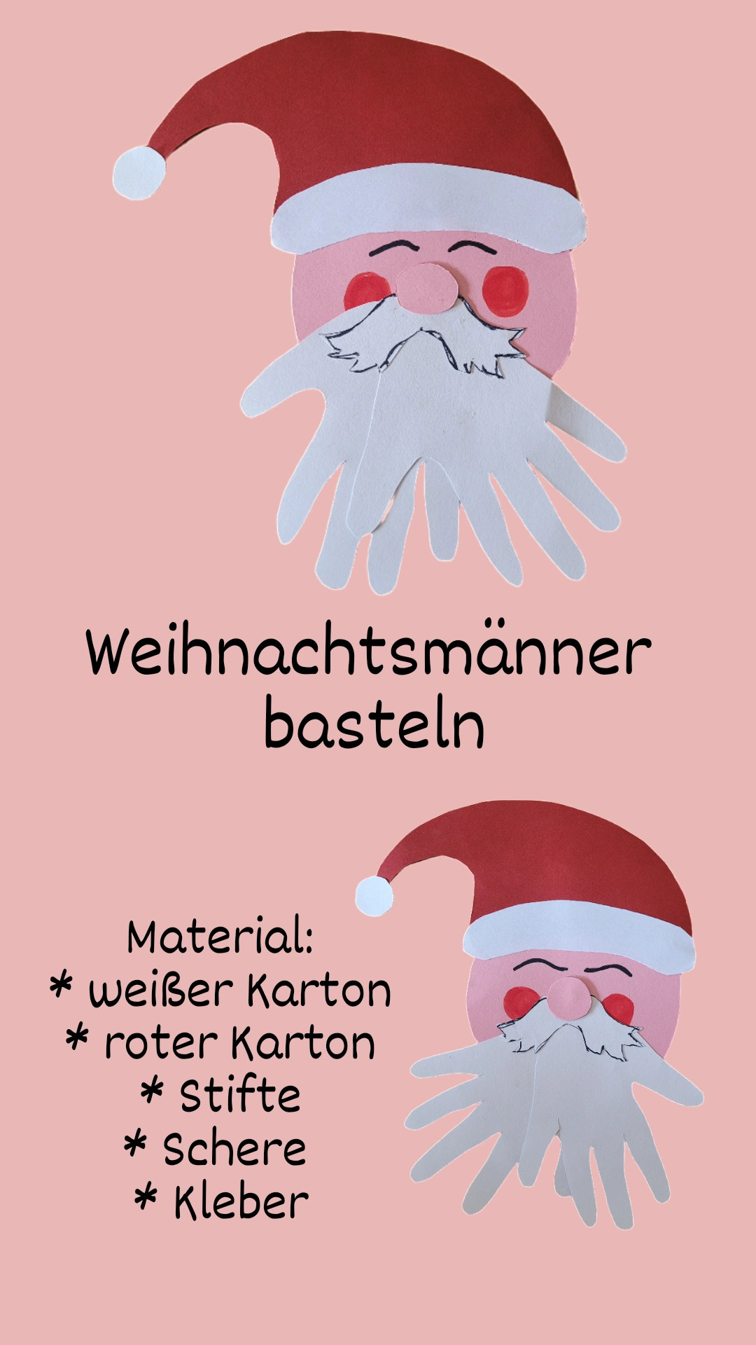 Zuerst den Umriss einer Hand auf weißes Kartonpapier aufmalen und ausschneiden – dann ein zweites Mal wiederholen. Die Hände ergeben den Bart des Weihnachtsmannes, der auf ein Gesicht aus rosa Karton geklebt wird. Eine rote Mütze und aufgemalte Augen und Wangen vervollständigen den Rest des Weihnachtsmannes.