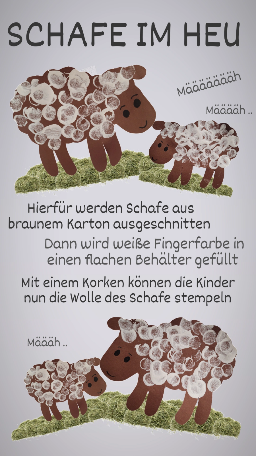 To prepare, cut out brown sheep from cardboard paper and paint on faces – preferably in different sizes so that whole ’sheep families‘ can be made. The thick sheep’s wool can now be stamped on with white finger paint and cork – and if you like, you can also stamp a green meadow.
