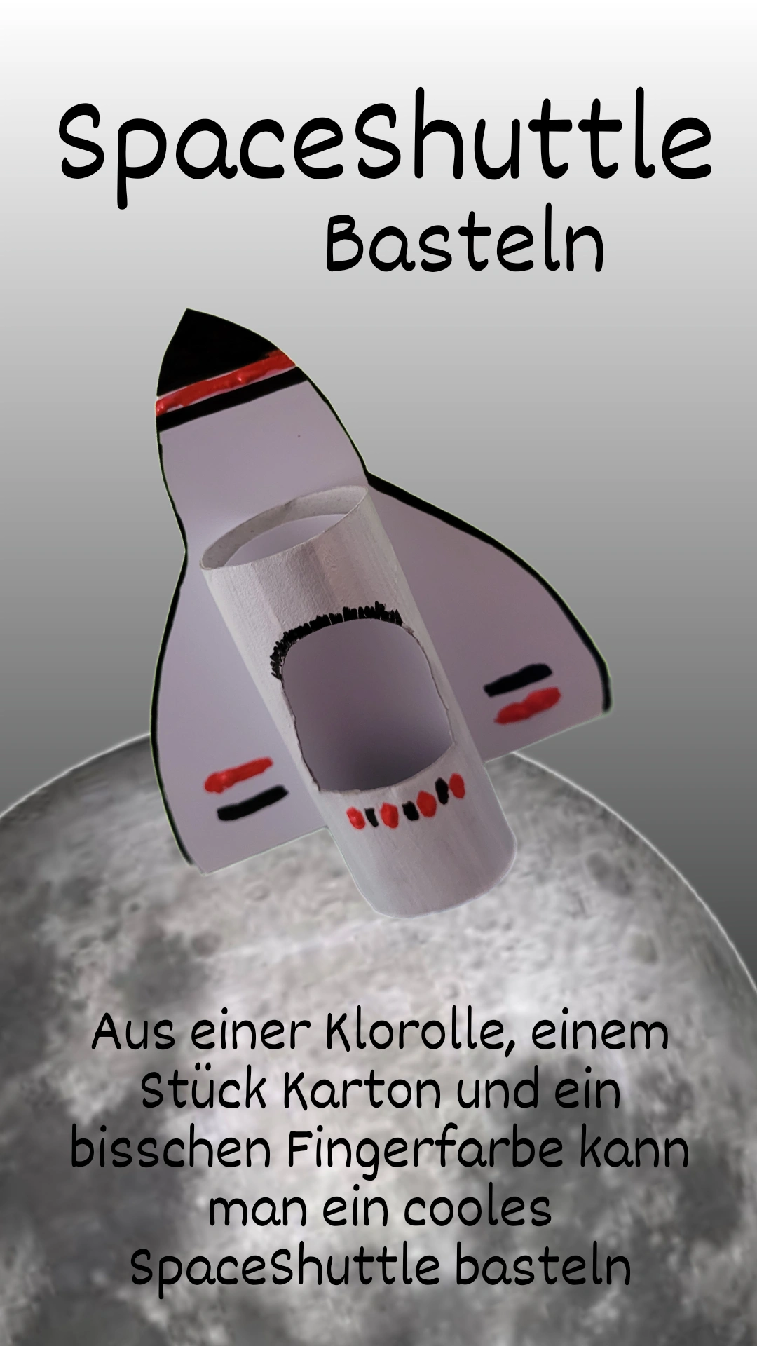 Die Basis dieses Spaceshuttles ist eine Klopapierrolle, die auf ein Stück Karton geklebt wird. Alles weiß anmalen, ein kleines Fenster in die Rolle schneiden. Mit roter und schwarzer Fingerfarbe können noch Details hinzugefügt werden, wie zum Beispiel die schwarze Spitze oder Markierungen an den Flügeln.